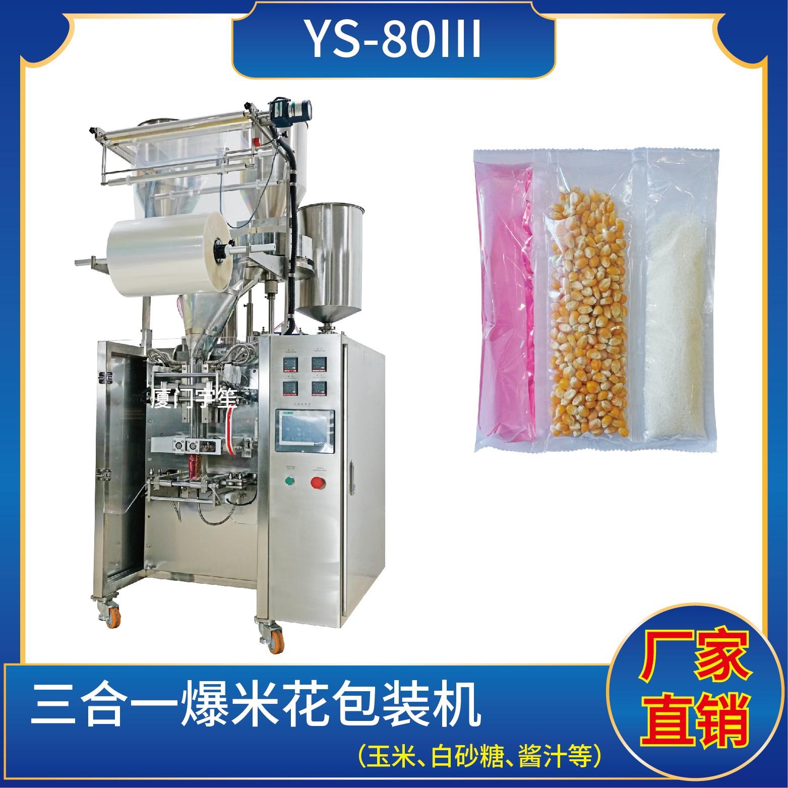 YS-80三列 三合一爆米花包裝機(使用鍍鋁、塑膠膜包裝)特點:1、適用于食品、醫(yī)藥、化工、化妝品行業(yè)中顆粒、粉劑、液體、醬料等物品的計量包裝。2、可自動完成制袋、計量、下料、封合、分切、計數(shù),可根據(jù)客戶要求配置打印批號等功能。3、觸摸屏操作,PLC控制,伺服電機控制袋長,性能穩(wěn)定、調(diào)整方便、檢測準(zhǔn)確。智能式溫…