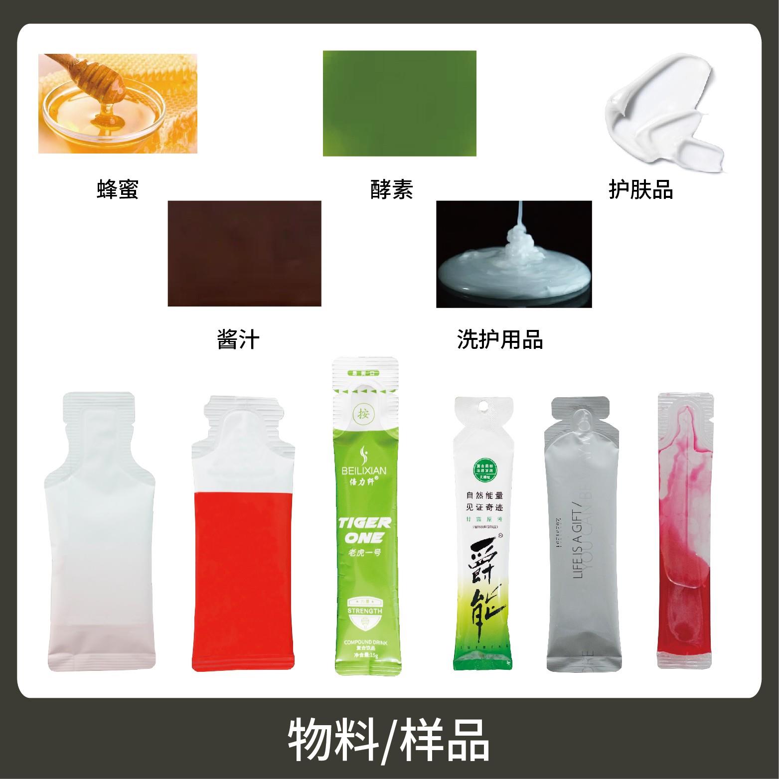 適用于各行業(yè)中酵素、果汁、漱口水、洗護(hù)用品、染發(fā)劑、化妝品小樣等醬料、液體物品的異形袋計量包裝。